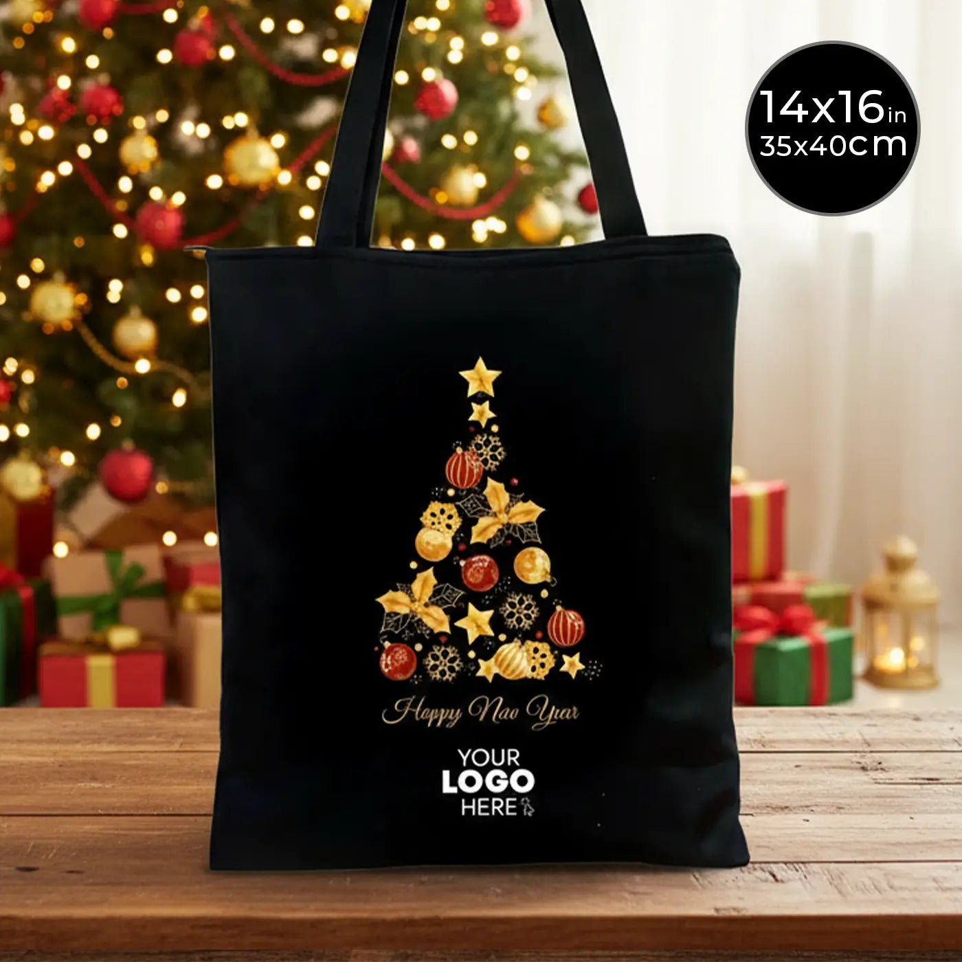 Personalized New Year Tote Bag 14" × 16" (35 × 40 cm) – Black Cotton Bag for Events