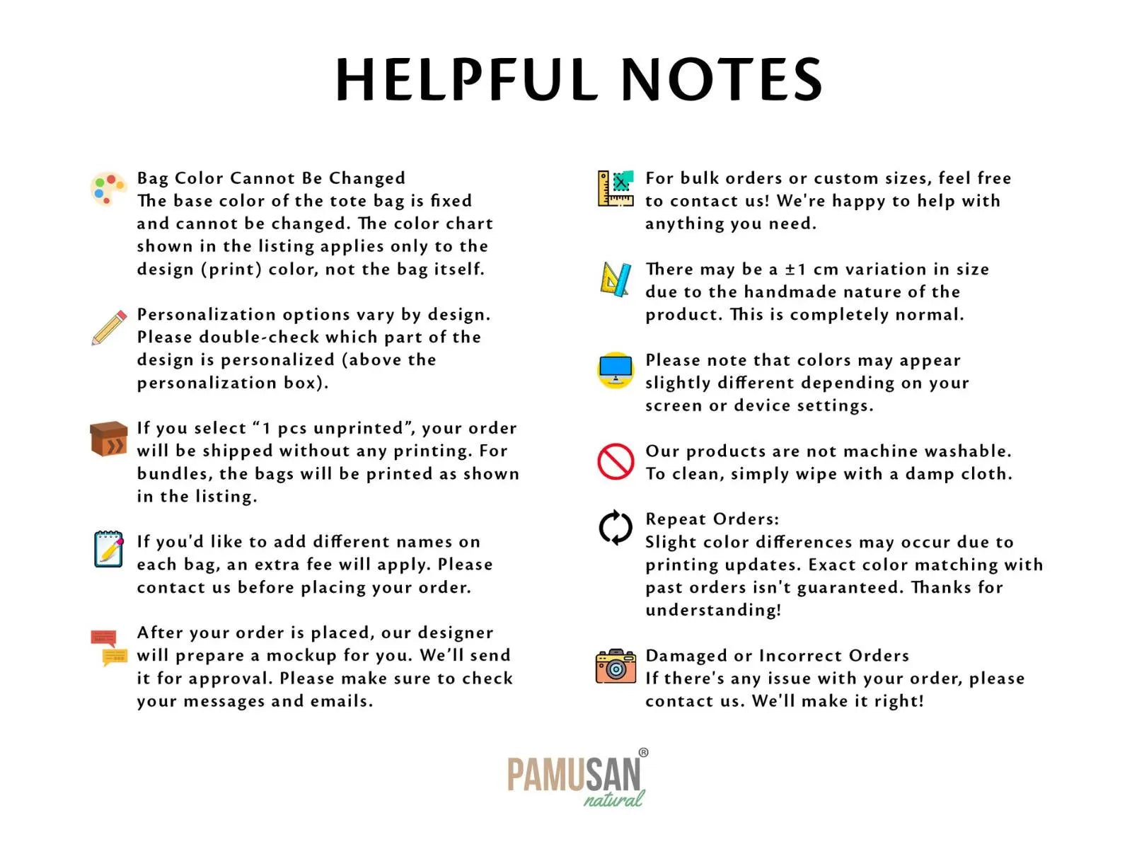 - Artwork submission: Email after checkout (no upload needed) – info@pamusan.com